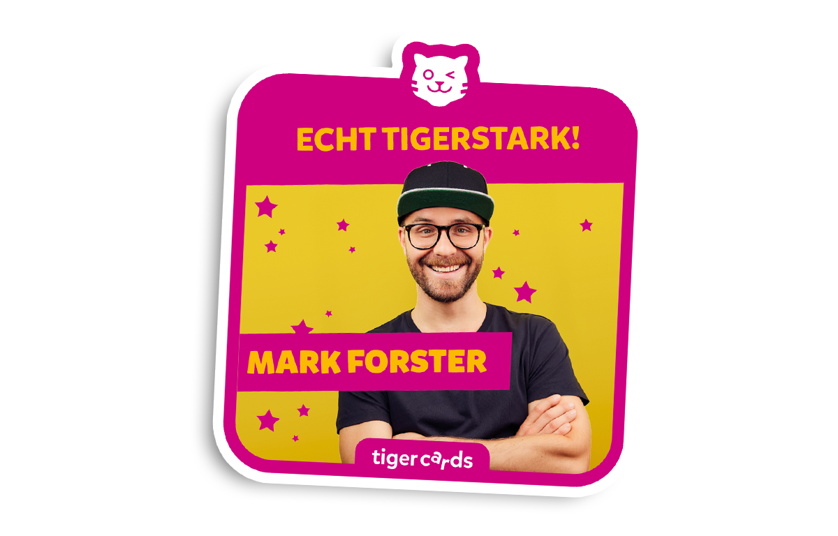 Mark Forster singt, textet, komponiert und steht für authentischen, deutschsprachigen Pop, wie derzeit kein anderer. Er ist ein Geschichtenerzähler, der uns über seine Songs an seinem Leben teilhaben lässt und dennoch nicht zu viel preisgibt. Leichtfüßig verbindet er Emotionen mit eingängigem Pop. Dabei hat sich der Mann mit Bart, Brille und Kappe das Schmunzeln in den Augen bewahrt. Das macht ihn sympathisch und nahbar. Und weil Mark Forster auch unter kleinen Hörerinnen und Hörern viele große Fans hat, gibt es jetzt mit der tigercard „Mark Forster – Echt tigerstark!“ eine exklusive Zusammenstellung seiner beliebtesten Hits nur für Kinder. Songs aus über einer Dekade – aktuell und zeitlos gleichermaßen – versammeln sich hier und laden zum Träumen, Nachdenken und Tanzen ein.